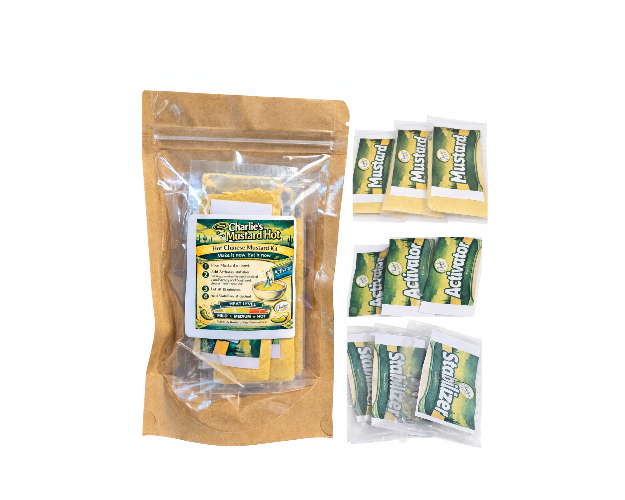 Charlie’s Hot Mustard Kit lets you create authentic Chinese-style hot mustard in minutes. Each kit includes premium mustard powder, an activator to unleash the heat, and a stabilizer to lock in flavor. Mix it fresh, control the intensity, and experience mustard the way it’s meant to be — bold, aromatic, and alive.